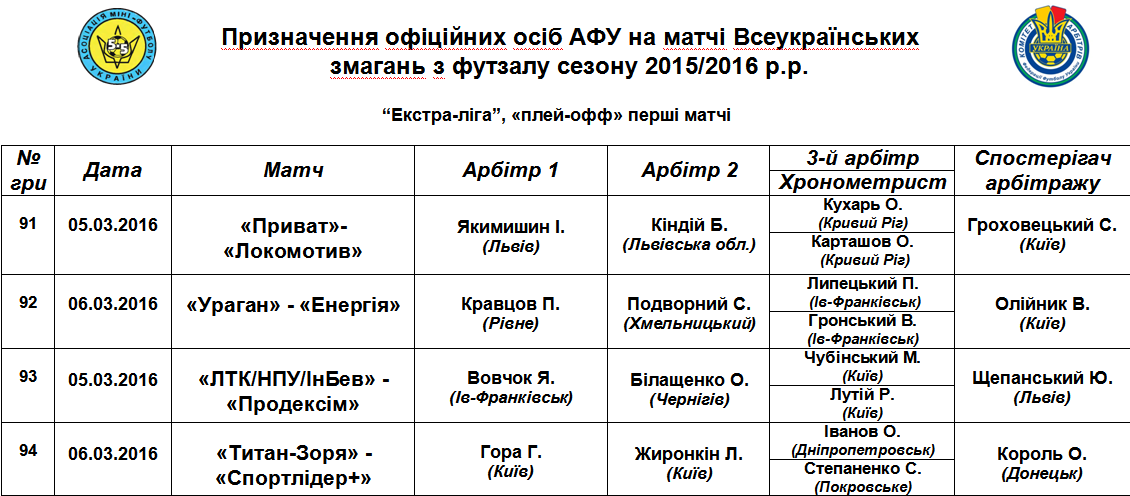 Комітет арбітражу АФУ призначив арбітрів та спостерігачів арбітражу, які будуть працювати на перших матчах 1/4-ої фіналу плей-офф Екстра-ліги та на зустрічах 14-го туру Першої ліги: