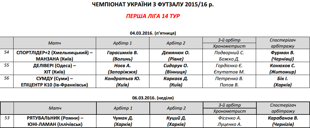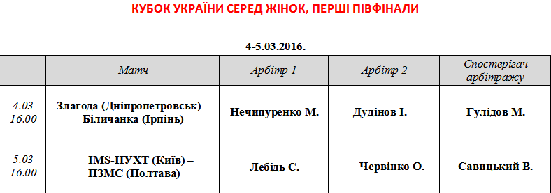 Призначення на перші матчі 1/4-ої фіналу плей-офф Екстра-ліги, 14 тур Першої ліги та півфінали Кубка України серед жінок